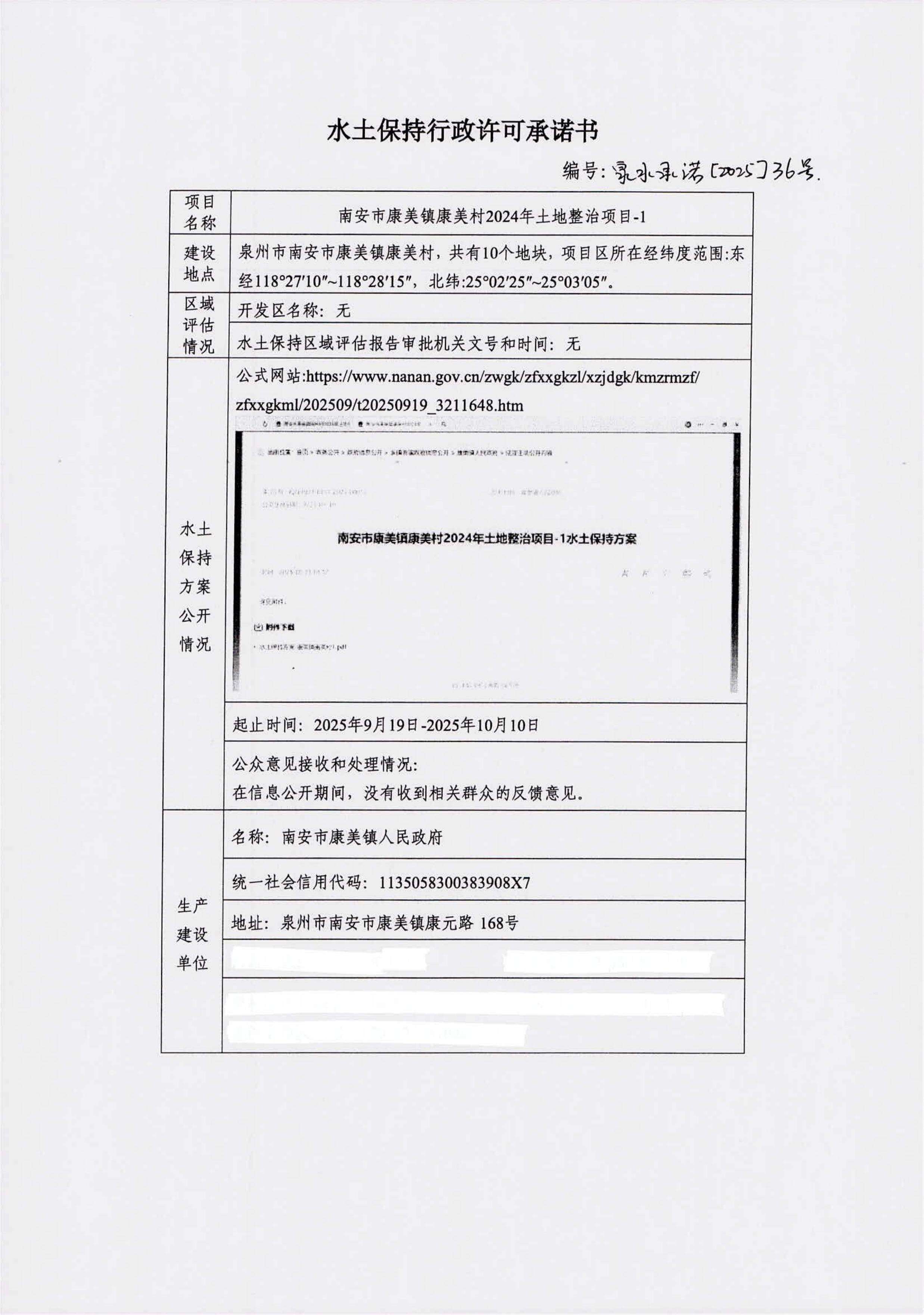 南安市康美镇康美村2024年土地整治项目-1水土保持行政许可承诺书