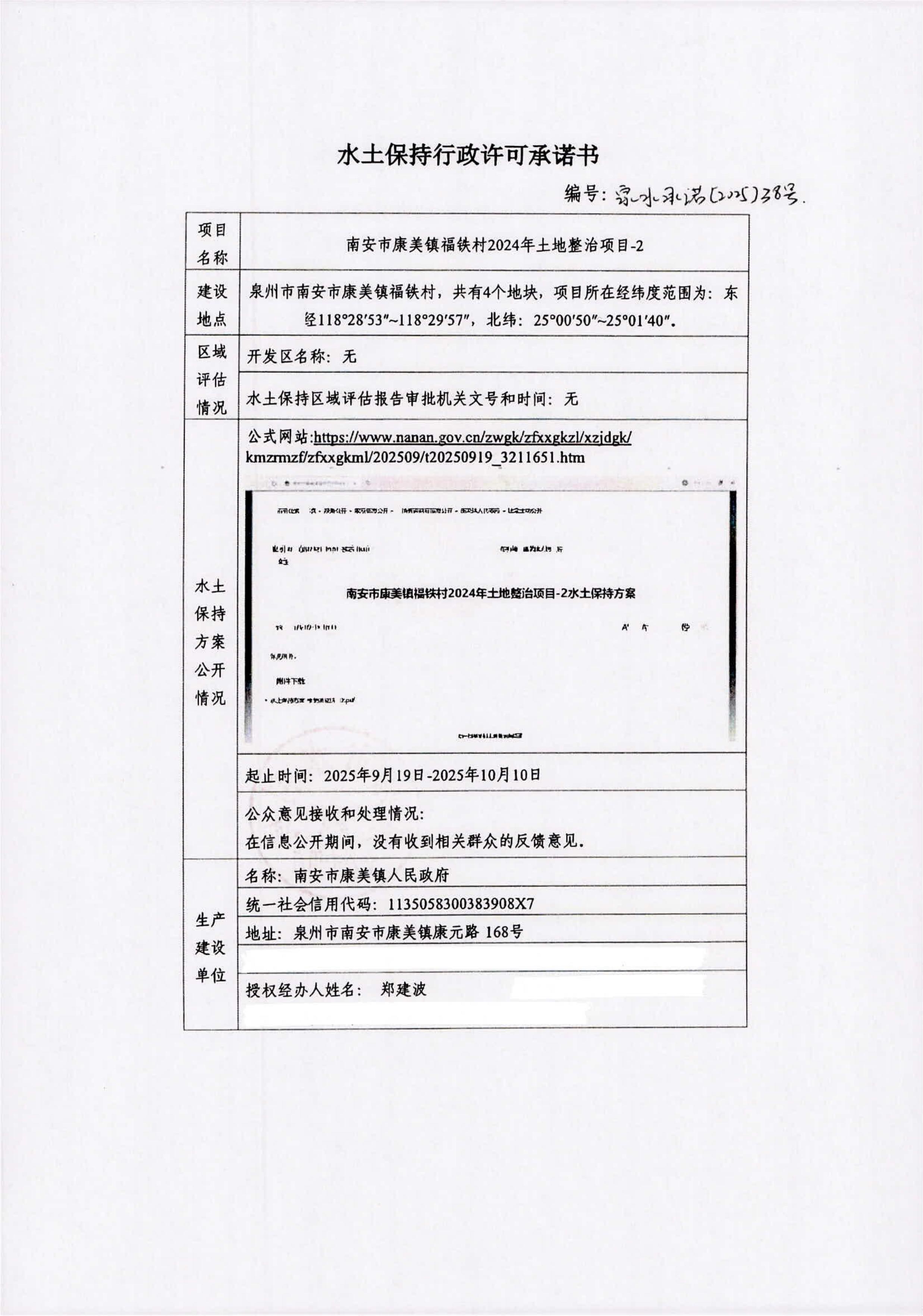 南安市康美镇福铁村2024年土地整治项目-2水土保持行政许可承诺书