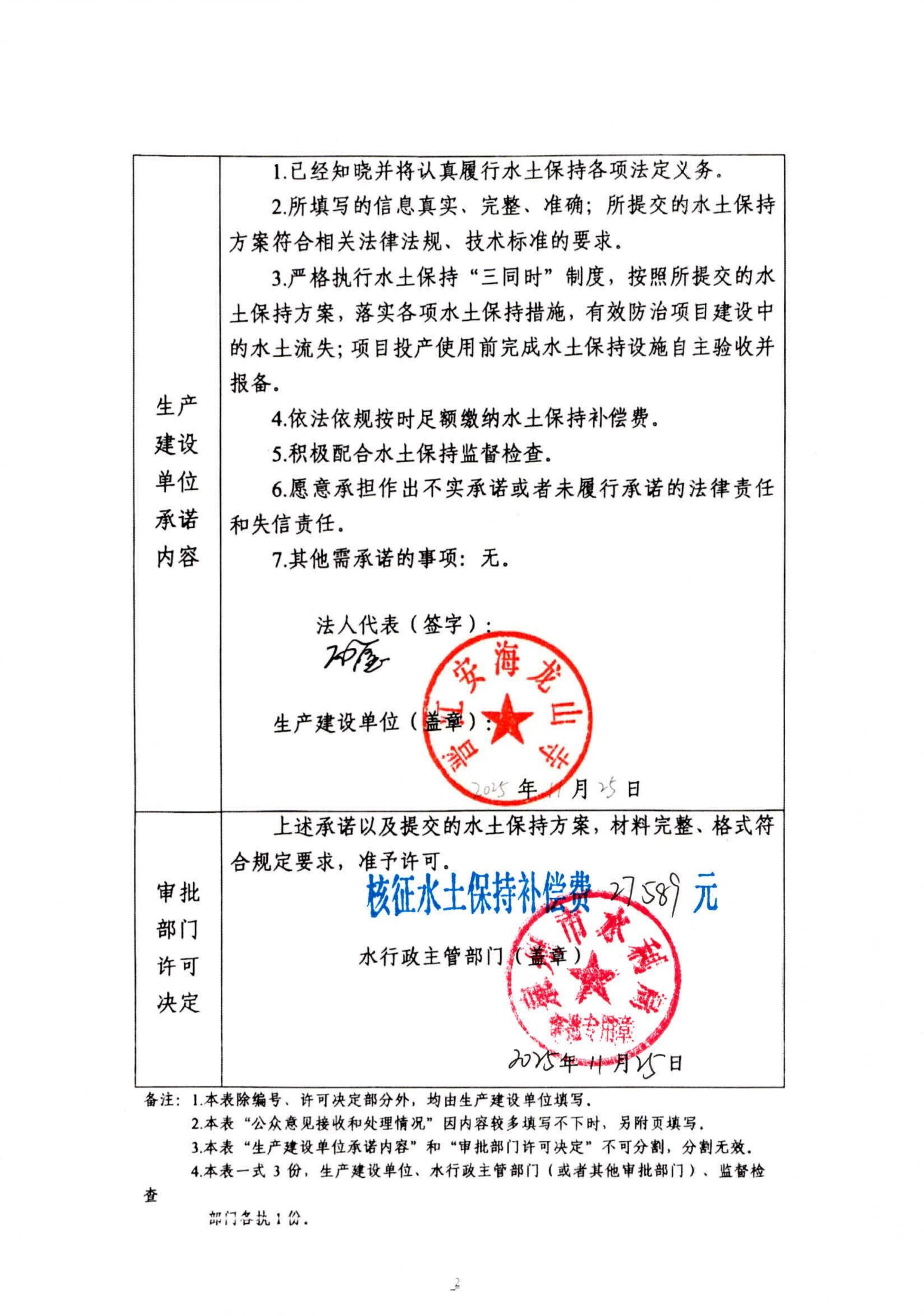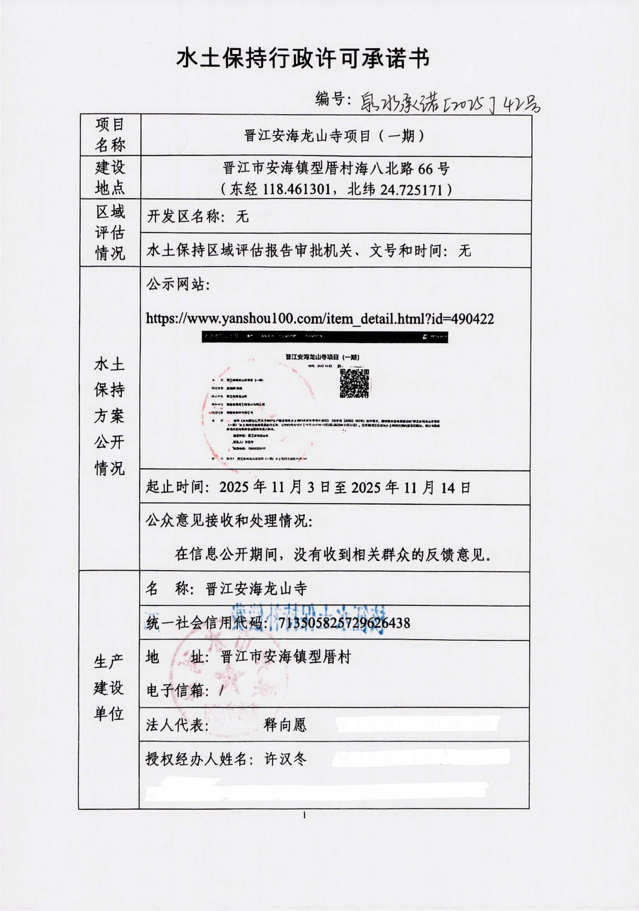 晋江安海龙山寺项目(一期)水土保持行政许可承诺书