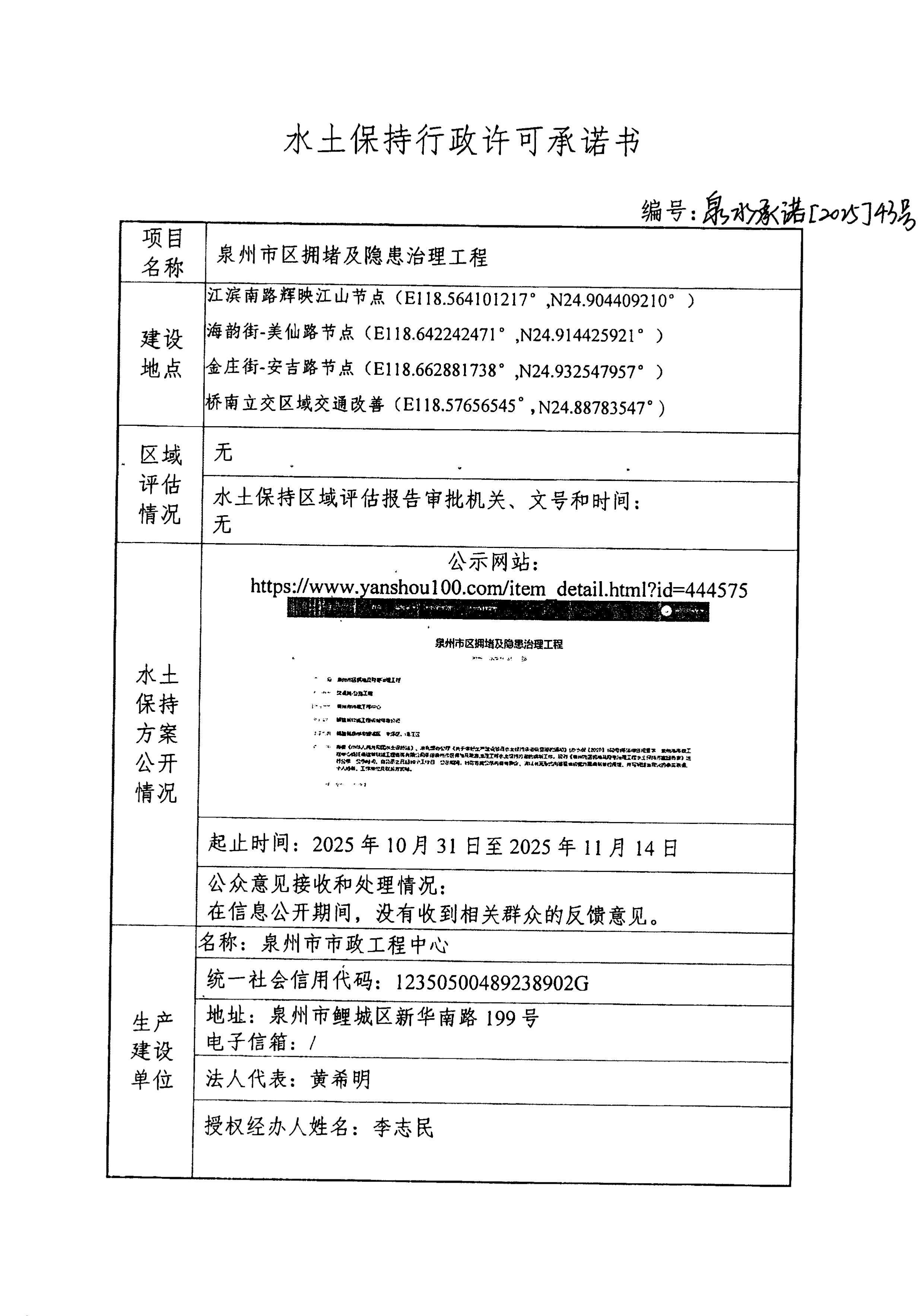 泉州市区拥堵及隐患治理工程水土保持行政许可承诺书