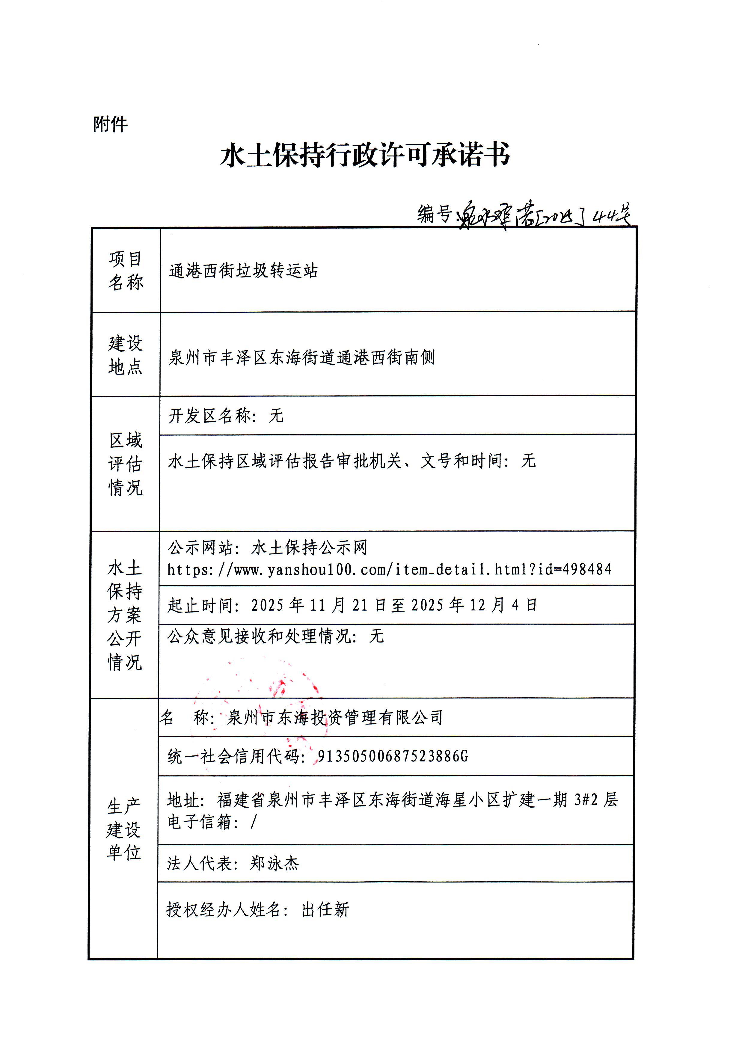 通港西街垃圾转运站水土保持行政许可承诺书