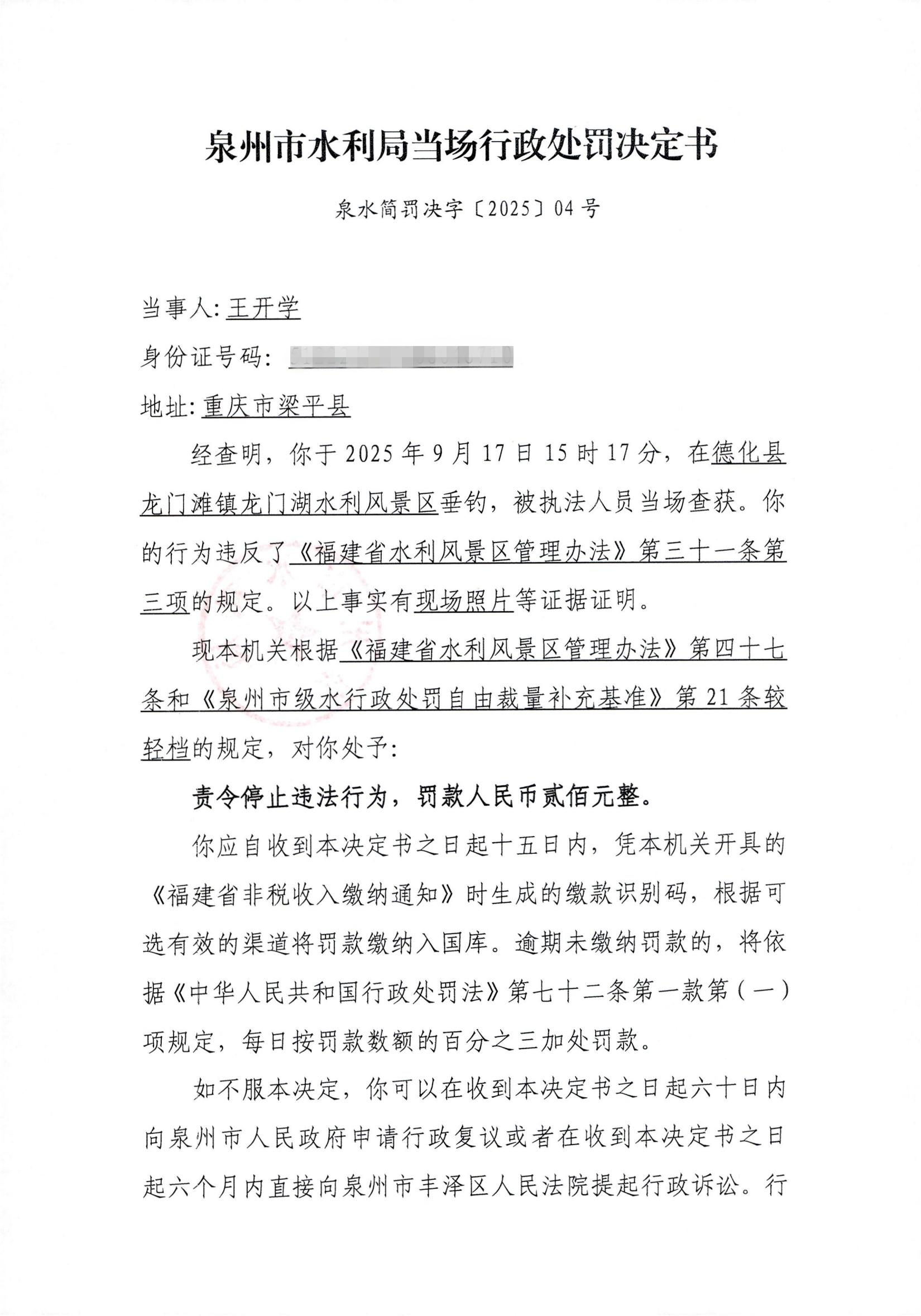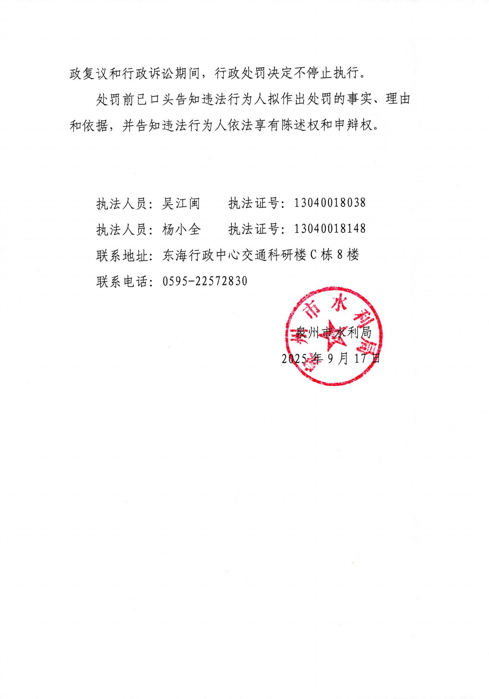 泉州市水利局当场行政处罚决定书(泉水简罚决字〔2025〕第04号)